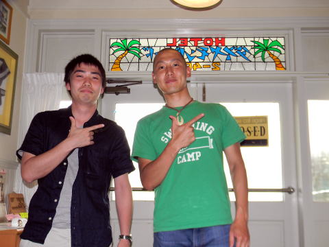 今日が23歳の誕生日というタイガさん♪(右) 反町君のファンとの事で付けてるサングラスは GTO放送時のレイバン反町君モデルだそうです。 左は会社で同期のケンジさん♪ 二人ともBeachboysのファンだそうですが放送は確か 17年前・・と言う事は当時6歳??? ませてたんですね〜(笑) |