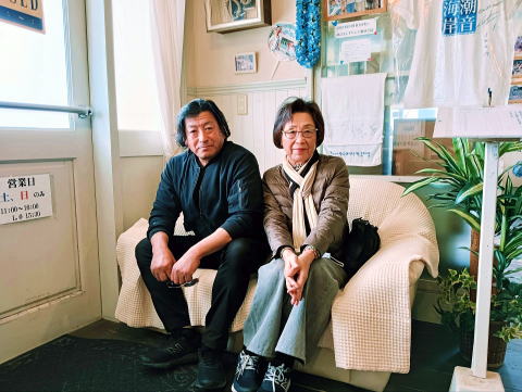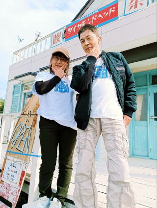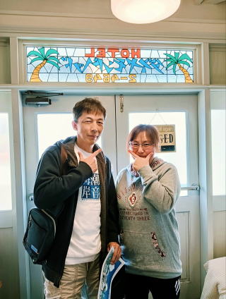 千葉県東金市から来ていただいた 渡部(ワタナベ)さんご夫妻 コロナ前、6年前に来ていただき潮音海岸 Tシャツを購入していただきました。 |