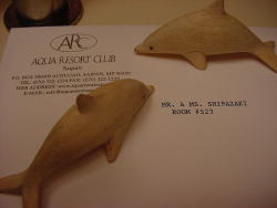 | 今回のサイパン旅行はロケ地探索もほとんど終わったし、憧れのアクア・リゾート・クラブに宿泊しのんびり常夏のサイパンを満喫するのが目的・・・のはずだったのが結果としてすばらしい発見と出会い、そして悲しい別れの旅行になりました。 1月7日(1日目) NW076便にて成田を出発しサイパンに15:00到着。今回はかなり空港で待たされてしまいアクアに着いたときにはすでに16時30分。ちょっぴりお疲れ・・でも、玄関に入るとゲスト・リレーションをされている懐かしの(って7ヶ月しか経っていませんが・・)永井さんを始めフロントスタッフ皆さんのやさしい笑顔に向かえられた途端心身ともに元気に復活。 (アクアホテルは本当にスタッフ全員が笑顔で話しかけてくれますよ) 17時にレンタカーを予約してあることから部屋に荷物を置いてすぐ出る予定だったけど、ベッド脇のデスクを見るとイルカ君の置物とメッセージが・・。 ちょっとした心遣いが嬉しいよね。アクア・リゾートについては別のコーナーで紹介しています。