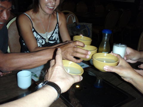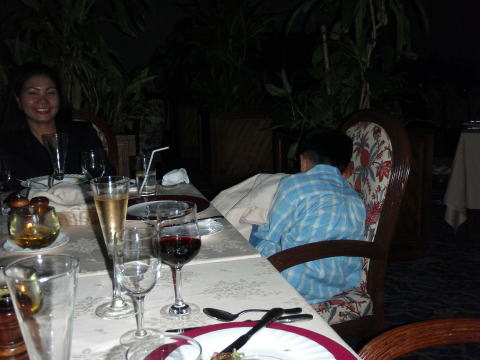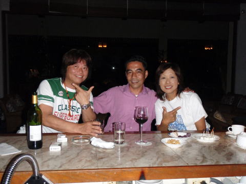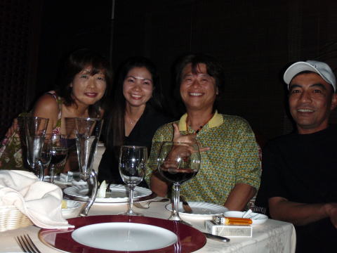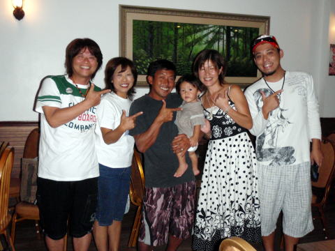 MITUさん、Marikoさん、Geno君家族と 小学校6年の時ビーチボーイズを見て感銘。以後ネソマニアに なってしまいサイパンに住み着いたというTOMOさんと6人 楽しいディナーを過ごさせていただきました。 二日酔いじゃなければ、もっとガンガン行けたんですけどね〜・・ |