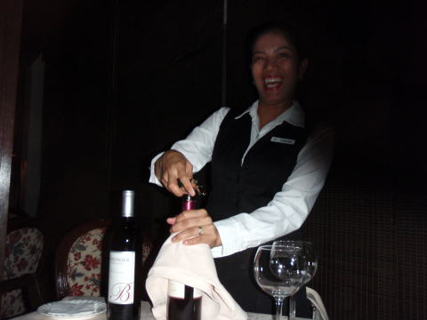 | 興奮冷め止まぬうちに夕方になってしまいました。 今日はロバートさん一家とラライナでディナーです。 テーブル係はティサさん♪ そう言えば以前ここでワインを2本開けたとき 「パパさんのんべね」って言ってたよね〜。 でもロバートさん聞いたらティサさんもかなりののんべだって 言ってましたよ〜(笑) |